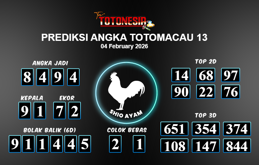 Toto Nesia : Bocoran Prediksi Togel NEW TOTOMACAU 13 Tanggal 04 FEBUARI 2026
