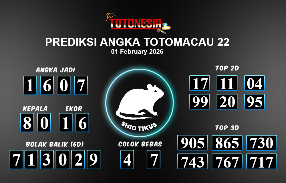 Toto Nesia : Bocoran Prediksi Togel NEW TOTOMACAU 22 Tanggal 01 FEBUARI 2026