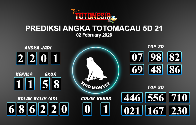 Prediksi TOTOMACAU 5D 21 adalah perhitungan nomor togel unggulan dari agen suhu togel yang menyajikan angka prediksi paling akurat, sehingga memberikan banyak keuntungan saat bermain di pasar togel TOTOMACAU 5D 21 . TotoNesia adalah prediksi dengan rasio kemenangan tertinggi di Indonesia. Sebagai penyedia togel yang dapat dipercaya, kami bertekad untuk memberikan ramalan togel yang handal dengan hadiah terbesarnya. Maka dari itu, jangan sampai terlewatkan prediksi bandar togel dengan hadiah terbanyak bet 100 dari pasar togel terbaik TOTOMACAU 5D 21 Daftar sekarang juga di bandar.