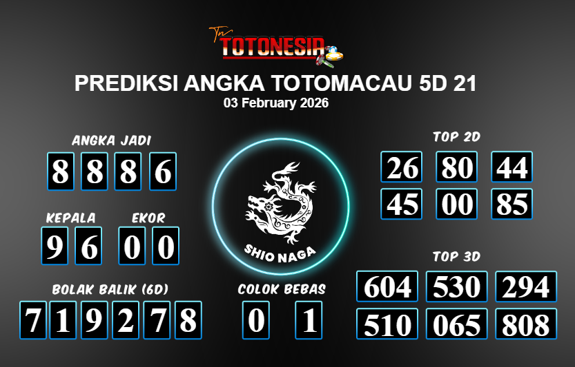 Prediksi TOTOMACAU 5D 21 adalah perhitungan nomor togel unggulan dari agen suhu togel yang menyajikan angka prediksi paling akurat, sehingga memberikan banyak keuntungan saat bermain di pasar togel TOTOMACAU 5D 21 . TotoNesia adalah prediksi dengan rasio kemenangan tertinggi di Indonesia. Sebagai penyedia togel yang dapat dipercaya, kami bertekad untuk memberikan ramalan togel yang handal dengan hadiah terbesarnya. Maka dari itu, jangan sampai terlewatkan prediksi bandar togel dengan hadiah terbanyak bet 100 dari pasar togel terbaik TOTOMACAU 5D 21 Daftar sekarang juga di bandar.