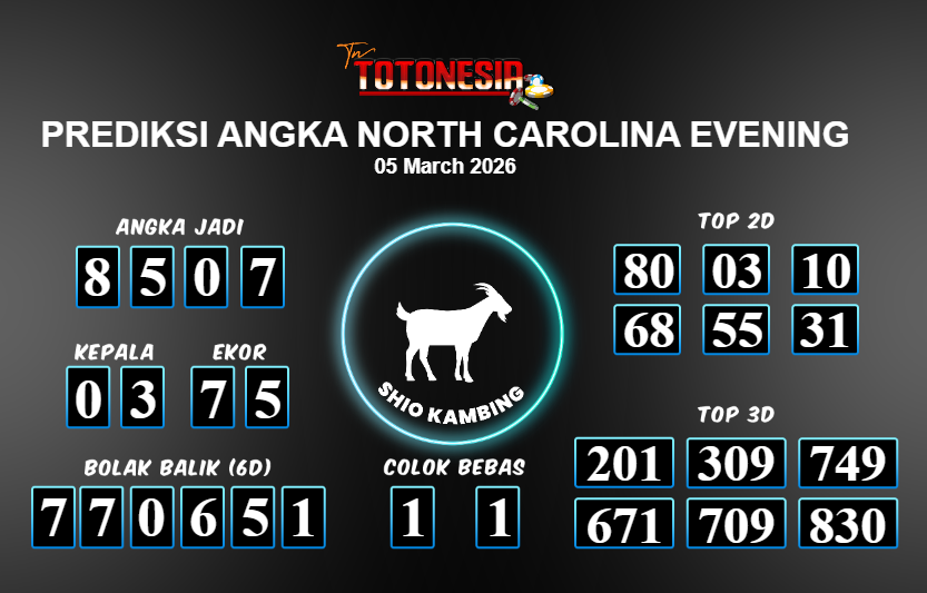 Toto Nesia : Bocoran Prediksi Togel NORTH CAROLINA EVENING Tanggal 05 MARET 2026