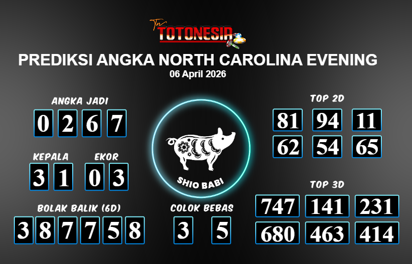 Toto Nesia : Bocoran Prediksi Togel NORTH CAROLINA EVENING Tanggal 06 APRIL 2026