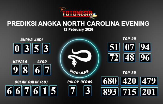 Toto Nesia : Bocoran Prediksi Togel NORTH CAROLINA EVENING Tanggal 12 FEBUARI 2026