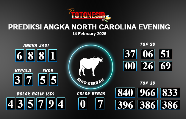 Toto Nesia : Bocoran Prediksi Togel NORTH CAROLINA EVENING Tanggal 14 FEBUARI 2026