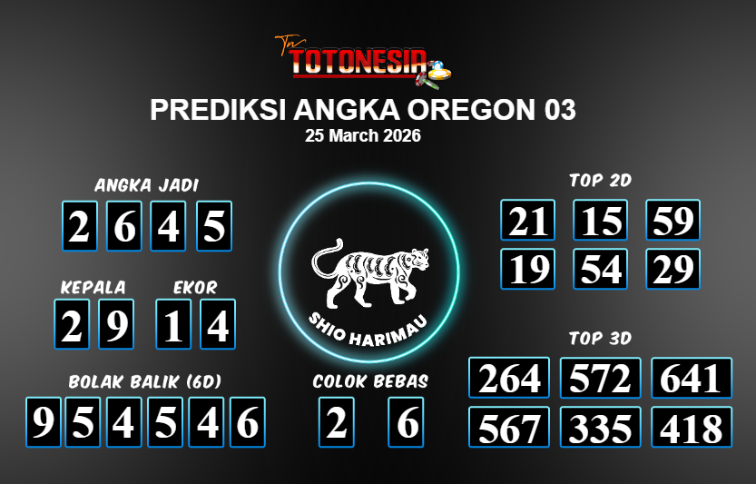 Prediksi OREGON 03 adalah perhitungan nomor togel unggulan dari agen suhu togel yang menyajikan angka prediksi paling akurat, sehingga memberikan banyak keuntungan saat bermain di pasar togel OREGON 03 . TotoNesia adalah prediksi dengan rasio kemenangan tertinggi di Indonesia. Sebagai penyedia togel yang dapat dipercaya, kami bertekad untuk memberikan ramalan togel yang handal dengan hadiah terbesarnya. Maka dari itu, jangan sampai terlewatkan prediksi bandar togel dengan hadiah terbanyak bet 100 dari pasar togel terbaik OREGON 03 Daftar sekarang juga di bandar.