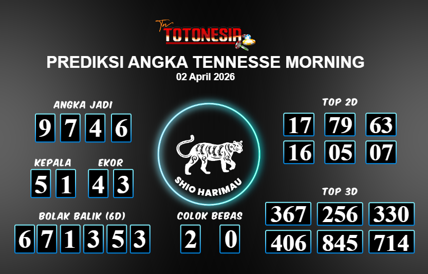 Prediksi TENNESSE MORNING adalah perhitungan nomor togel unggulan dari agen suhu togel yang menyajikan angka prediksi paling akurat, sehingga memberikan banyak keuntungan saat bermain di pasar togel TENNESSE MORNING . TotoNesia adalah prediksi dengan rasio kemenangan tertinggi di Indonesia. Sebagai penyedia togel yang dapat dipercaya, kami bertekad untuk memberikan ramalan togel yang handal dengan hadiah terbesarnya. Maka dari itu, jangan sampai terlewatkan prediksi bandar togel dengan hadiah terbanyak bet 100 dari pasar togel terbaik TENNESSE MORNING Daftar sekarang juga di bandar.