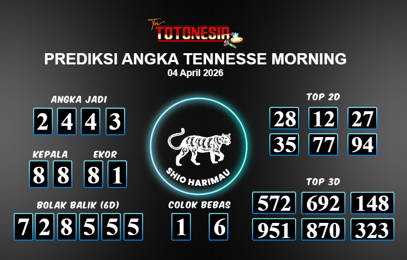 Prediksi TENNESSE MORNING adalah perhitungan nomor togel unggulan dari agen suhu togel yang menyajikan angka prediksi paling akurat, sehingga memberikan banyak keuntungan saat bermain di pasar togel TENNESSE MORNING . TotoNesia adalah prediksi dengan rasio kemenangan tertinggi di Indonesia. Sebagai penyedia togel yang dapat dipercaya, kami bertekad untuk memberikan ramalan togel yang handal dengan hadiah terbesarnya. Maka dari itu, jangan sampai terlewatkan prediksi bandar togel dengan hadiah terbanyak bet 100 dari pasar togel terbaik TENNESSE MORNING Daftar sekarang juga di bandar.