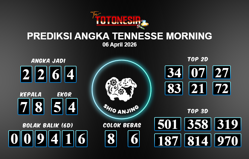 Prediksi TENNESSE MORNING adalah perhitungan nomor togel unggulan dari agen suhu togel yang menyajikan angka prediksi paling akurat, sehingga memberikan banyak keuntungan saat bermain di pasar togel TENNESSE MORNING . TotoNesia adalah prediksi dengan rasio kemenangan tertinggi di Indonesia. Sebagai penyedia togel yang dapat dipercaya, kami bertekad untuk memberikan ramalan togel yang handal dengan hadiah terbesarnya. Maka dari itu, jangan sampai terlewatkan prediksi bandar togel dengan hadiah terbanyak bet 100 dari pasar togel terbaik TENNESSE MORNING Daftar sekarang juga di bandar.