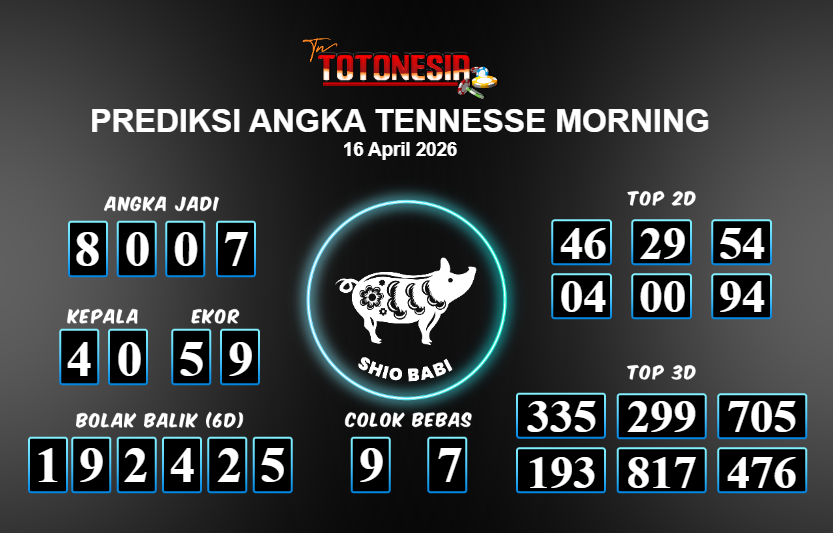 Prediksi TENNESSE MORNING adalah perhitungan nomor togel unggulan dari agen suhu togel yang menyajikan angka prediksi paling akurat, sehingga memberikan banyak keuntungan saat bermain di pasar togel TENNESSE MORNING . TotoNesia adalah prediksi dengan rasio kemenangan tertinggi di Indonesia. Sebagai penyedia togel yang dapat dipercaya, kami bertekad untuk memberikan ramalan togel yang handal dengan hadiah terbesarnya. Maka dari itu, jangan sampai terlewatkan prediksi bandar togel dengan hadiah terbanyak bet 100 dari pasar togel terbaik TENNESSE MORNING Daftar sekarang juga di bandar.