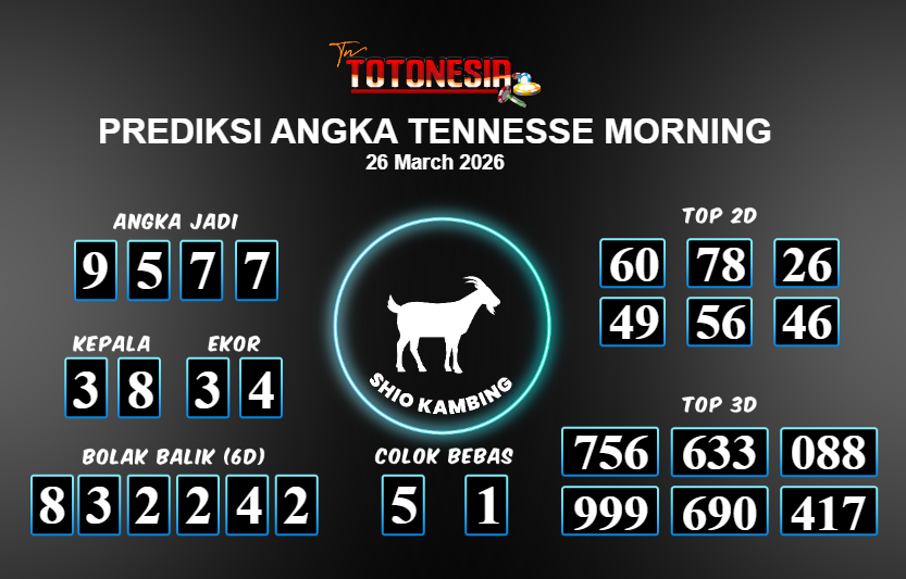 Prediksi TENNESSE MORNING adalah perhitungan nomor togel unggulan dari agen suhu togel yang menyajikan angka prediksi paling akurat, sehingga memberikan banyak keuntungan saat bermain di pasar togel TENNESSE MORNING . TotoNesia adalah prediksi dengan rasio kemenangan tertinggi di Indonesia. Sebagai penyedia togel yang dapat dipercaya, kami bertekad untuk memberikan ramalan togel yang handal dengan hadiah terbesarnya. Maka dari itu, jangan sampai terlewatkan prediksi bandar togel dengan hadiah terbanyak bet 100 dari pasar togel terbaik TENNESSE MORNING Daftar sekarang juga di bandar.