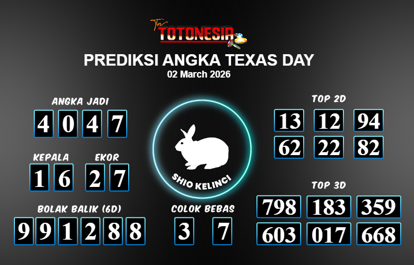 Toto Nesia : Bocoran Prediksi Togel TEXAS DAY Tanggal 02 MARET 2026