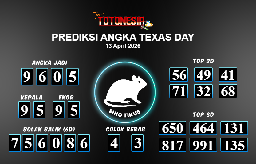 Prediksi TEXAS DAY adalah perhitungan nomor togel unggulan dari agen suhu togel yang menyajikan angka prediksi paling akurat, sehingga memberikan banyak keuntungan saat bermain di pasar togel TEXAS DAY. TotoNesia adalah prediksi dengan rasio kemenangan tertinggi di Indonesia. Sebagai penyedia togel yang dapat dipercaya, kami bertekad untuk memberikan ramalan togel yang handal dengan hadiah terbesarnya. Maka dari itu, jangan sampai terlewatkan prediksi bandar togel dengan hadiah terbanyak bet 100 dari pasar togel terbaik TEXAS DAY Daftar sekarang juga di bandar.