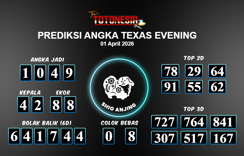 Prediksi TEXAS EVENING adalah perhitungan nomor togel unggulan dari agen suhu togel yang menyajikan angka prediksi paling akurat, sehingga memberikan banyak keuntungan saat bermain di pasar togel TEXAS EVENING . TotoNesia adalah prediksi dengan rasio kemenangan tertinggi di Indonesia. Sebagai penyedia togel yang dapat dipercaya, kami bertekad untuk memberikan ramalan togel yang handal dengan hadiah terbesarnya. Maka dari itu, jangan sampai terlewatkan prediksi bandar togel dengan hadiah terbanyak bet 100 dari pasar togel terbaik TEXAS EVENING Daftar sekarang juga di bandar.