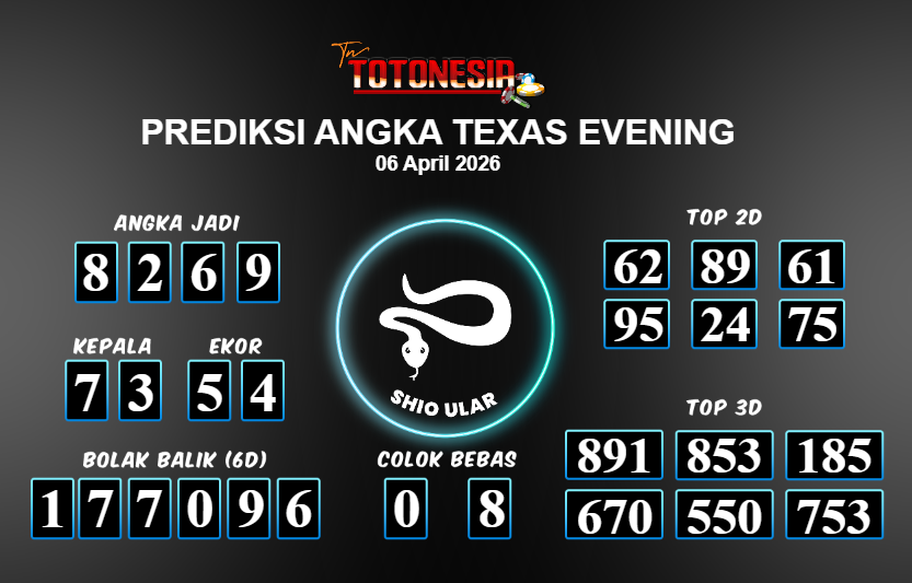 Prediksi TEXAS EVENING adalah perhitungan nomor togel unggulan dari agen suhu togel yang menyajikan angka prediksi paling akurat, sehingga memberikan banyak keuntungan saat bermain di pasar togel TEXAS EVENING . TotoNesia adalah prediksi dengan rasio kemenangan tertinggi di Indonesia. Sebagai penyedia togel yang dapat dipercaya, kami bertekad untuk memberikan ramalan togel yang handal dengan hadiah terbesarnya. Maka dari itu, jangan sampai terlewatkan prediksi bandar togel dengan hadiah terbanyak bet 100 dari pasar togel terbaik TEXAS EVENING Daftar sekarang juga di bandar.