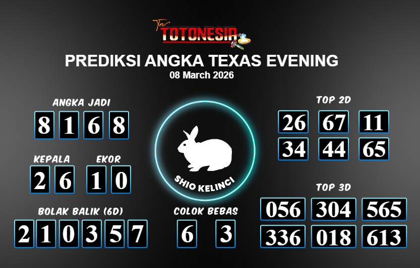 Prediksi TEXAS EVENING adalah perhitungan nomor togel unggulan dari agen suhu togel yang menyajikan angka prediksi paling akurat, sehingga memberikan banyak keuntungan saat bermain di pasar togel TEXAS EVENING . TotoNesia adalah prediksi dengan rasio kemenangan tertinggi di Indonesia. Sebagai penyedia togel yang dapat dipercaya, kami bertekad untuk memberikan ramalan togel yang handal dengan hadiah terbesarnya. Maka dari itu, jangan sampai terlewatkan prediksi bandar togel dengan hadiah terbanyak bet 100 dari pasar togel terbaik TEXAS EVENING Daftar sekarang juga di bandar.