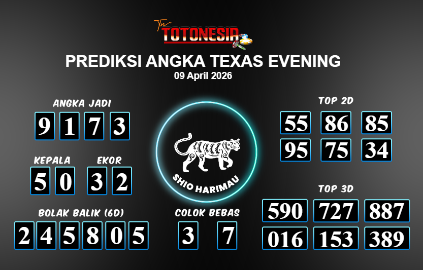 Prediksi TEXAS EVENING adalah perhitungan nomor togel unggulan dari agen suhu togel yang menyajikan angka prediksi paling akurat, sehingga memberikan banyak keuntungan saat bermain di pasar togel TEXAS EVENING . TotoNesia adalah prediksi dengan rasio kemenangan tertinggi di Indonesia. Sebagai penyedia togel yang dapat dipercaya, kami bertekad untuk memberikan ramalan togel yang handal dengan hadiah terbesarnya. Maka dari itu, jangan sampai terlewatkan prediksi bandar togel dengan hadiah terbanyak bet 100 dari pasar togel terbaik TEXAS EVENING Daftar sekarang juga di bandar.