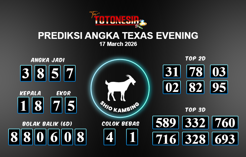 Prediksi TEXAS EVENING adalah perhitungan nomor togel unggulan dari agen suhu togel yang menyajikan angka prediksi paling akurat, sehingga memberikan banyak keuntungan saat bermain di pasar togel TEXAS EVENING . TotoNesia adalah prediksi dengan rasio kemenangan tertinggi di Indonesia. Sebagai penyedia togel yang dapat dipercaya, kami bertekad untuk memberikan ramalan togel yang handal dengan hadiah terbesarnya. Maka dari itu, jangan sampai terlewatkan prediksi bandar togel dengan hadiah terbanyak bet 100 dari pasar togel terbaik TEXAS EVENING Daftar sekarang juga di bandar.
