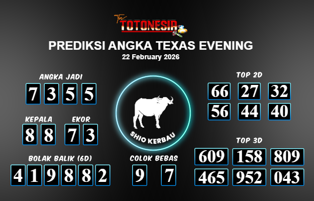 Toto Nesia : Bocoran Prediksi Togel TEXAS EVENING Tanggal 22 FEBUARI 2026