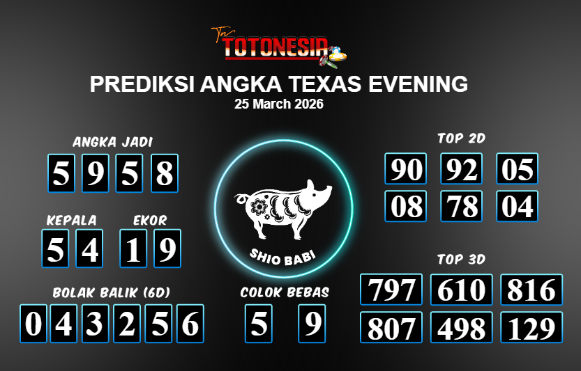 Prediksi TEXAS EVENING adalah perhitungan nomor togel unggulan dari agen suhu togel yang menyajikan angka prediksi paling akurat, sehingga memberikan banyak keuntungan saat bermain di pasar togel TEXAS EVENING . TotoNesia adalah prediksi dengan rasio kemenangan tertinggi di Indonesia. Sebagai penyedia togel yang dapat dipercaya, kami bertekad untuk memberikan ramalan togel yang handal dengan hadiah terbesarnya. Maka dari itu, jangan sampai terlewatkan prediksi bandar togel dengan hadiah terbanyak bet 100 dari pasar togel terbaik TEXAS EVENING Daftar sekarang juga di bandar.
