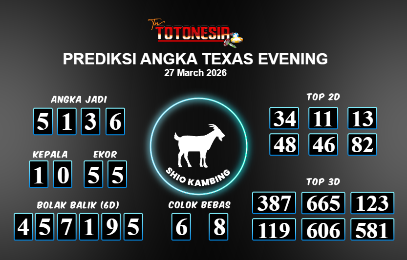 Prediksi TEXAS EVENING adalah perhitungan nomor togel unggulan dari agen suhu togel yang menyajikan angka prediksi paling akurat, sehingga memberikan banyak keuntungan saat bermain di pasar togel TEXAS EVENING . TotoNesia adalah prediksi dengan rasio kemenangan tertinggi di Indonesia. Sebagai penyedia togel yang dapat dipercaya, kami bertekad untuk memberikan ramalan togel yang handal dengan hadiah terbesarnya. Maka dari itu, jangan sampai terlewatkan prediksi bandar togel dengan hadiah terbanyak bet 100 dari pasar togel terbaik TEXAS EVENING Daftar sekarang juga di bandar.