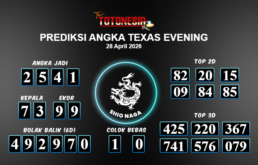 Prediksi TEXAS EVENING adalah perhitungan nomor togel unggulan dari agen suhu togel yang menyajikan angka prediksi paling akurat, sehingga memberikan banyak keuntungan saat bermain di pasar togel TEXAS EVENING . TotoNesia adalah prediksi dengan rasio kemenangan tertinggi di Indonesia. Sebagai penyedia togel yang dapat dipercaya, kami bertekad untuk memberikan ramalan togel yang handal dengan hadiah terbesarnya. Maka dari itu, jangan sampai terlewatkan prediksi bandar togel dengan hadiah terbanyak bet 100 dari pasar togel terbaik TEXAS EVENING Daftar sekarang juga di bandar.