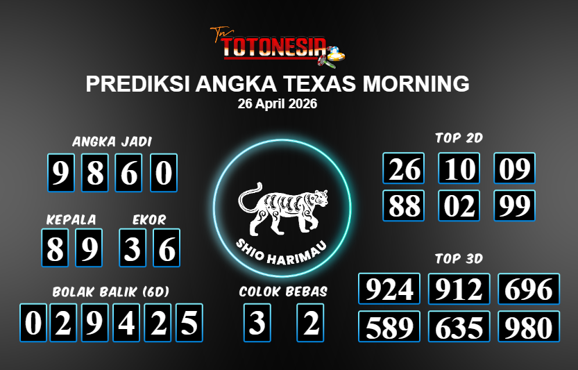 Toto Nesia : Bocoran Prediksi Togel TEXAS MORNING Tanggal 26 APRIL 2026