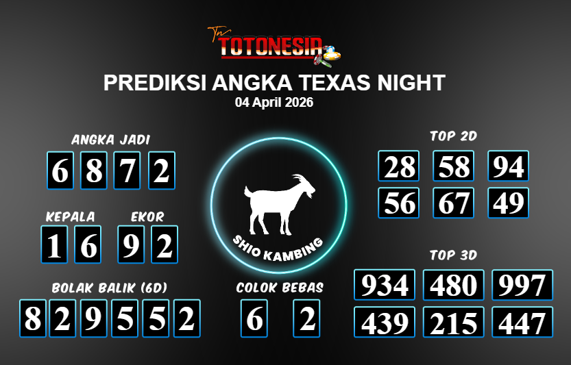 Toto Nesia : Bocoran Prediksi Togel TEXAS NIGHT Tanggal 04 APRIL 2026