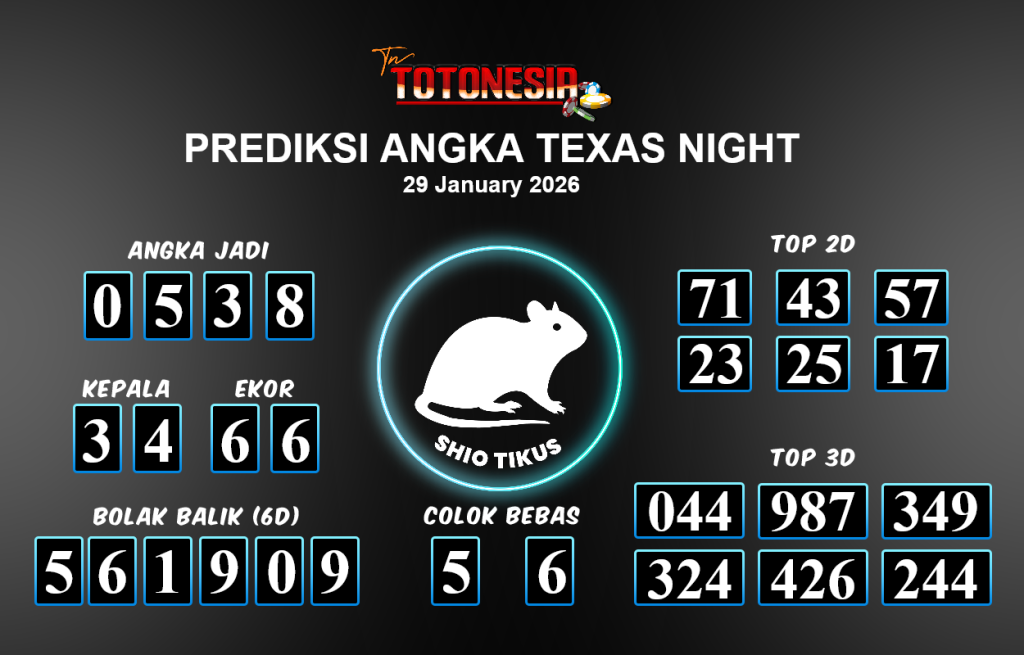Prediksi TEXAS NIGHT adalah perhitungan nomor togel unggulan dari agen suhu togel yang menyajikan angka prediksi paling akurat, sehingga memberikan banyak keuntungan saat bermain di pasar togel TEXAS NIGHT. TotoNesia adalah prediksi dengan rasio kemenangan tertinggi di Indonesia. Sebagai penyedia togel yang dapat dipercaya, kami bertekad untuk memberikan ramalan togel yang handal dengan hadiah terbesarnya. Maka dari itu, jangan sampai terlewatkan prediksi bandar togel dengan hadiah terbanyak bet 100 dari pasar togel terbaik TEXAS NIGHT daftar sekarang juga di bandar.