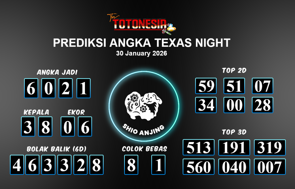 Prediksi TEXAS NIGHT adalah perhitungan nomor togel unggulan dari agen suhu togel yang menyajikan angka prediksi paling akurat, sehingga memberikan banyak keuntungan saat bermain di pasar togel TEXAS NIGHT. TotoNesia adalah prediksi dengan rasio kemenangan tertinggi di Indonesia. Sebagai penyedia togel yang dapat dipercaya, kami bertekad untuk memberikan ramalan togel yang handal dengan hadiah terbesarnya. Maka dari itu, jangan sampai terlewatkan prediksi bandar togel dengan hadiah terbanyak bet 100 dari pasar togel terbaik TEXAS NIGHT Daftar sekarang juga di bandar.