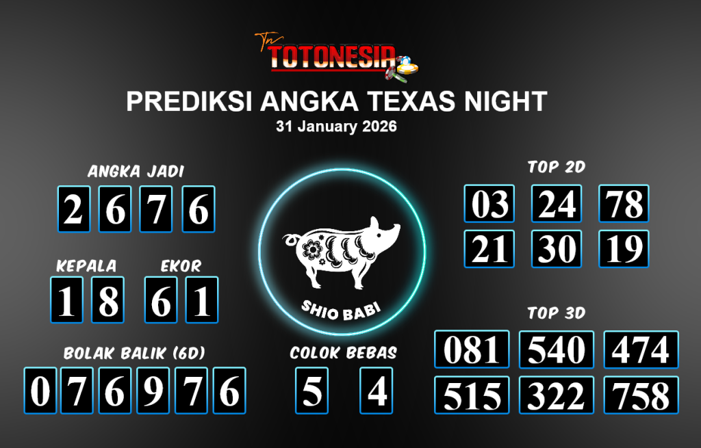 Prediksi TEXAS NIGHT adalah perhitungan nomor togel unggulan dari agen suhu togel yang menyajikan angka prediksi paling akurat, sehingga memberikan banyak keuntungan saat bermain di pasar togel TEXAS NIGHT. TotoNesia adalah prediksi dengan rasio kemenangan tertinggi di Indonesia. Sebagai penyedia togel yang dapat dipercaya, kami bertekad untuk memberikan ramalan togel yang handal dengan hadiah terbesarnya. Maka dari itu, jangan sampai terlewatkan prediksi bandar togel dengan hadiah terbanyak bet 100 dari pasar togel terbaik TEXAS NIGHT Daftar sekarang juga di bandar.