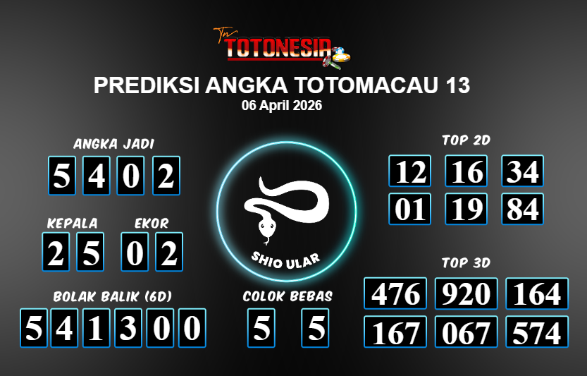 Toto Nesia : Bocoran Prediksi Togel TOTOMACAU 13 Tanggal 06 APRIL 2026