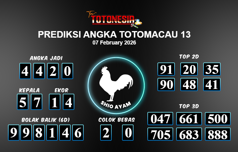 Toto Nesia : Bocoran Prediksi Togel TOTOMACAU 13 Tanggal 07 FEBUARI 2026