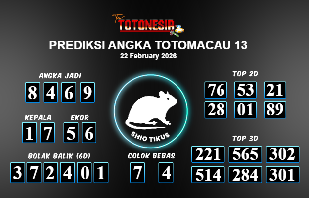 Toto Nesia : Bocoran Prediksi Togel TOTOMACAU 13 Tanggal 22 FEBUARI 2026