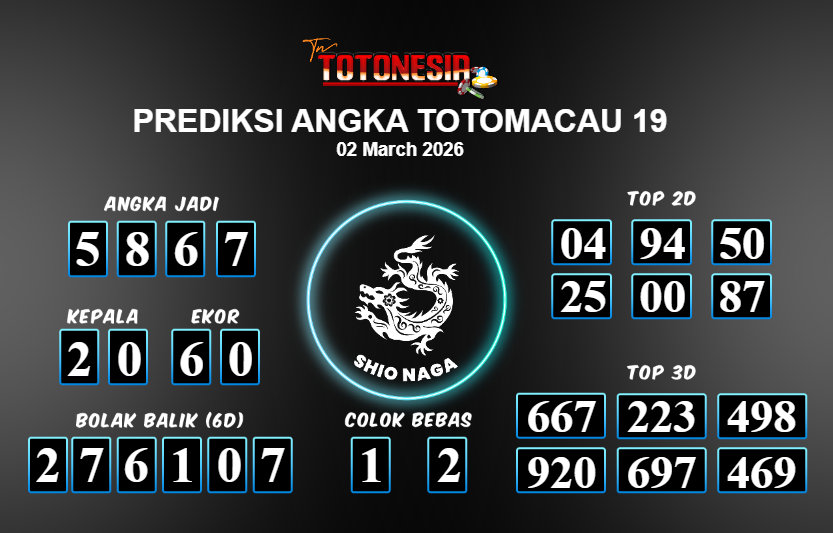 Toto Nesia : Bocoran Prediksi Togel TOTOMACAU 19 Tanggal 02 MARET 2026