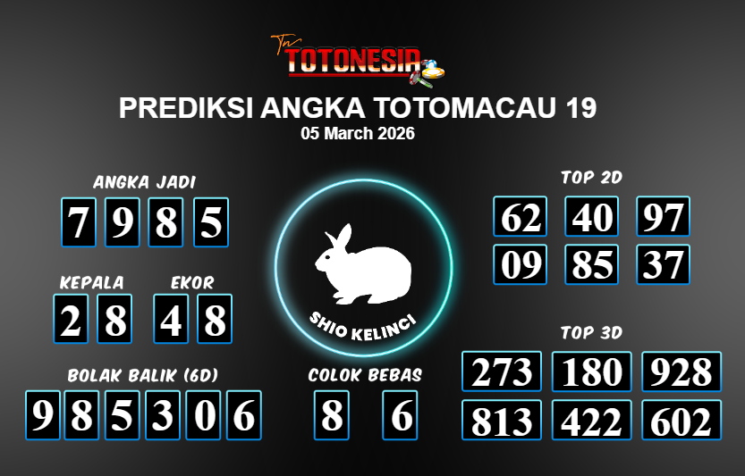 Prediksi TOTOMACAU 19 adalah perhitungan nomor togel unggulan dari agen suhu togel yang menyajikan angka prediksi paling akurat, sehingga memberikan banyak keuntungan saat bermain di pasar togel TOTOMACAU 19 . TotoNesia adalah prediksi dengan rasio kemenangan tertinggi di Indonesia. Sebagai penyedia togel yang dapat dipercaya, kami bertekad untuk memberikan ramalan togel yang handal dengan hadiah terbesarnya. Maka dari itu, jangan sampai terlewatkan prediksi bandar togel dengan hadiah terbanyak bet 100 dari pasar togel terbaik TOTOMACAU 19 Daftar sekarang juga di bandar.