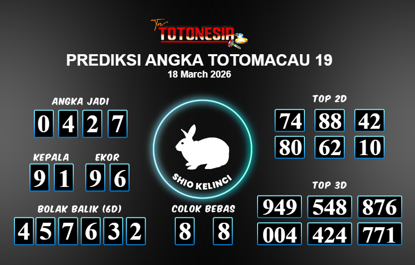 Prediksi TOTOMACAU 19 adalah perhitungan nomor togel unggulan dari agen suhu togel yang menyajikan angka prediksi paling akurat, sehingga memberikan banyak keuntungan saat bermain di pasar togel TOTOMACAU 19 . TotoNesia adalah prediksi dengan rasio kemenangan tertinggi di Indonesia. Sebagai penyedia togel yang dapat dipercaya, kami bertekad untuk memberikan ramalan togel yang handal dengan hadiah terbesarnya. Maka dari itu, jangan sampai terlewatkan prediksi bandar togel dengan hadiah terbanyak bet 100 dari pasar togel terbaik TOTOMACAU 19 Daftar sekarang juga di bandar.