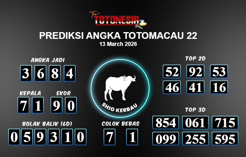 Toto Nesia : Bocoran Prediksi Togel TOTOMACAU 22 Tanggal 13 MARET 2026