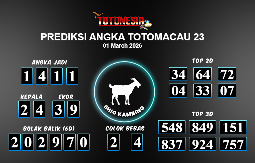 Toto Nesia : Bocoran Prediksi Togel TOTOMACAU 23 Tanggal 01 MARET 2026