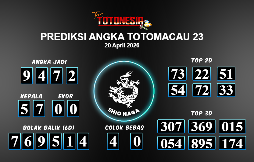 Toto Nesia : Bocoran Prediksi Togel TOTOMACAU 23 Tanggal 20 APRIL 2026