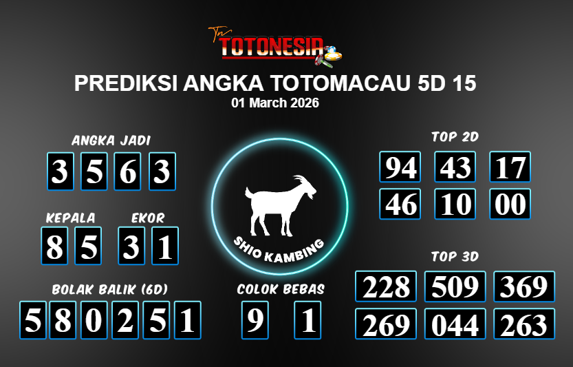 Toto Nesia : Bocoran Prediksi Togel TOTOMACAU 5D 15 Tanggal 01 MARET 2026