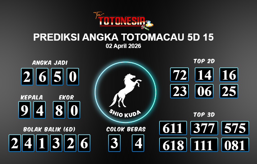 Toto Nesia : Bocoran Prediksi Togel TOTOMACAU 5D 15 Tanggal 02 APRIL 2026