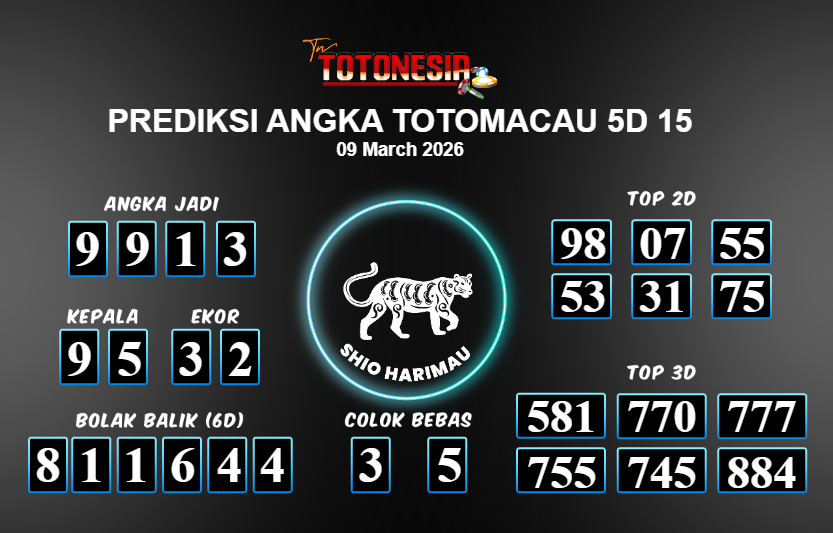 Toto Nesia : Bocoran Prediksi Togel TOTOMACAU 5D 15 Tanggal 09 MARET 2026