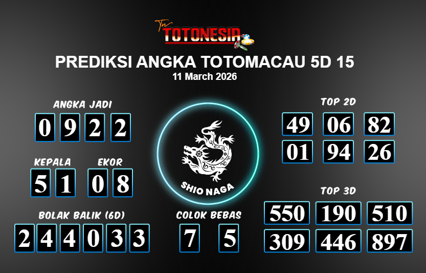 Toto Nesia : Bocoran Prediksi Togel TOTOMACAU 5D 15 Tanggal 11 MARET 2026