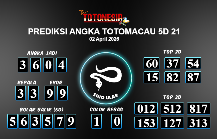 Prediksi TOTOMACAU 5D 21 adalah perhitungan nomor togel unggulan dari agen suhu togel yang menyajikan angka prediksi paling akurat, sehingga memberikan banyak keuntungan saat bermain di pasar togel TOTOMACAU 5D 21 . TotoNesia adalah prediksi dengan rasio kemenangan tertinggi di Indonesia. Sebagai penyedia togel yang dapat dipercaya, kami bertekad untuk memberikan ramalan togel yang handal dengan hadiah terbesarnya. Maka dari itu, jangan sampai terlewatkan prediksi bandar togel dengan hadiah terbanyak bet 100 dari pasar togel terbaik TOTOMACAU 5D 21 Daftar sekarang juga di bandar.