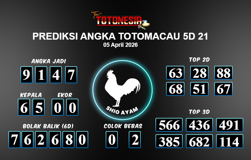 Prediksi TOTOMACAU 5D 21 adalah perhitungan nomor togel unggulan dari agen suhu togel yang menyajikan angka prediksi paling akurat, sehingga memberikan banyak keuntungan saat bermain di pasar togel TOTOMACAU 5D 21 . TotoNesia adalah prediksi dengan rasio kemenangan tertinggi di Indonesia. Sebagai penyedia togel yang dapat dipercaya, kami bertekad untuk memberikan ramalan togel yang handal dengan hadiah terbesarnya. Maka dari itu, jangan sampai terlewatkan prediksi bandar togel dengan hadiah terbanyak bet 100 dari pasar togel terbaik TOTOMACAU 5D 21 Daftar sekarang juga di bandar.
