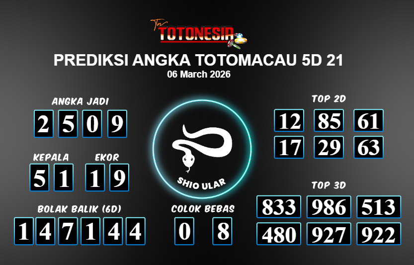 Prediksi TOTOMACAU 5D 21 adalah perhitungan nomor togel unggulan dari agen suhu togel yang menyajikan angka prediksi paling akurat, sehingga memberikan banyak keuntungan saat bermain di pasar togel TOTOMACAU 5D 21 . TotoNesia adalah prediksi dengan rasio kemenangan tertinggi di Indonesia. Sebagai penyedia togel yang dapat dipercaya, kami bertekad untuk memberikan ramalan togel yang handal dengan hadiah terbesarnya. Maka dari itu, jangan sampai terlewatkan prediksi bandar togel dengan hadiah terbanyak bet 100 dari pasar togel terbaik TOTOMACAU 5D 21 Daftar sekarang juga di bandar.