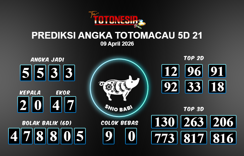 Toto Nesia : Bocoran Prediksi Togel TOTOMACAU 5D 21 Tanggal 09 APRIL 2026