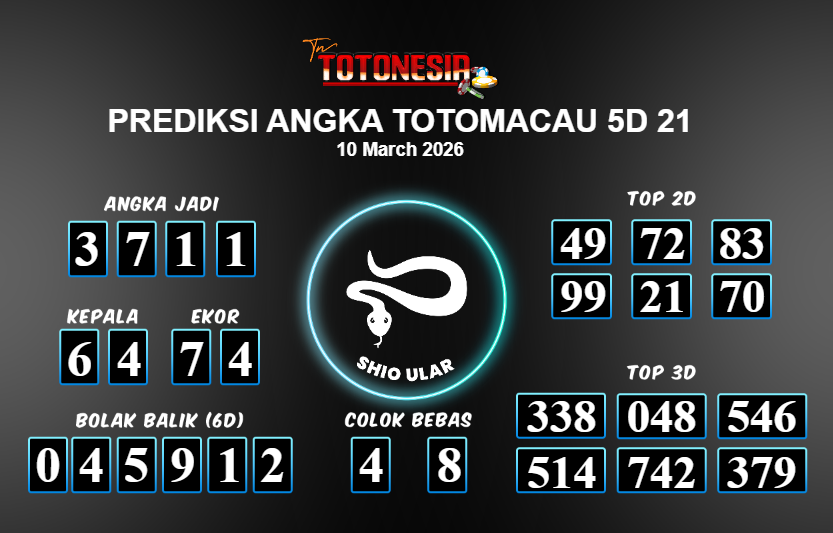 Prediksi TOTOMACAU 5D 21 adalah perhitungan nomor togel unggulan dari agen suhu togel yang menyajikan angka prediksi paling akurat, sehingga memberikan banyak keuntungan saat bermain di pasar togel TOTOMACAU 5D 21 . TotoNesia adalah prediksi dengan rasio kemenangan tertinggi di Indonesia. Sebagai penyedia togel yang dapat dipercaya, kami bertekad untuk memberikan ramalan togel yang handal dengan hadiah terbesarnya. Maka dari itu, jangan sampai terlewatkan prediksi bandar togel dengan hadiah terbanyak bet 100 dari pasar togel terbaik TOTOMACAU 5D 21 Daftar sekarang juga di bandar.