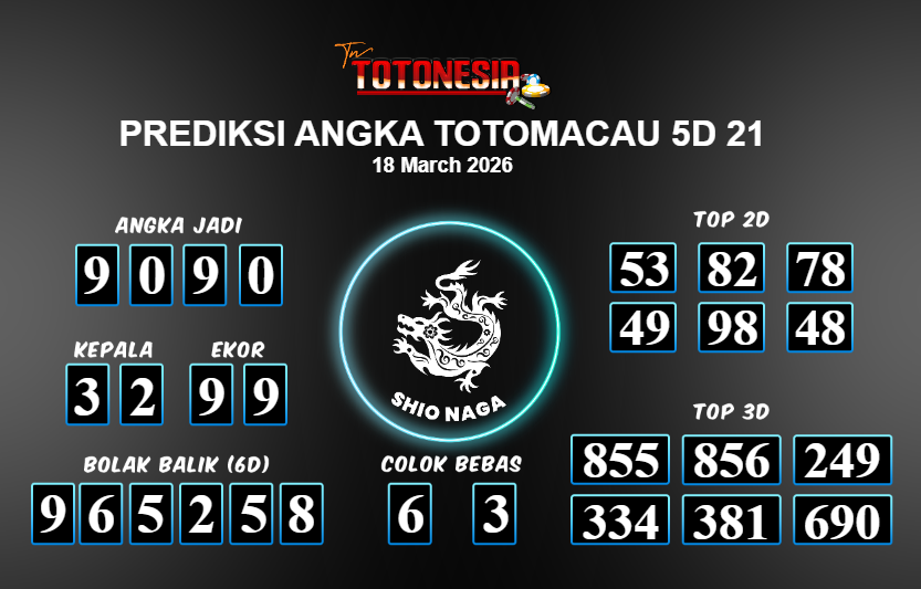Prediksi TOTOMACAU 5D 21 adalah perhitungan nomor togel unggulan dari agen suhu togel yang menyajikan angka prediksi paling akurat, sehingga memberikan banyak keuntungan saat bermain di pasar togel TOTOMACAU 5D 21 . TotoNesia adalah prediksi dengan rasio kemenangan tertinggi di Indonesia. Sebagai penyedia togel yang dapat dipercaya, kami bertekad untuk memberikan ramalan togel yang handal dengan hadiah terbesarnya. Maka dari itu, jangan sampai terlewatkan prediksi bandar togel dengan hadiah terbanyak bet 100 dari pasar togel terbaik TOTOMACAU 5D 21 Daftar sekarang juga di bandar.