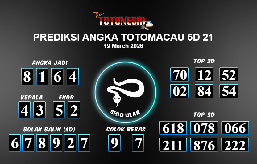 Prediksi TOTOMACAU 5D 21 adalah perhitungan nomor togel unggulan dari agen suhu togel yang menyajikan angka prediksi paling akurat, sehingga memberikan banyak keuntungan saat bermain di pasar togel TOTOMACAU 5D 21 . TotoNesia adalah prediksi dengan rasio kemenangan tertinggi di Indonesia. Sebagai penyedia togel yang dapat dipercaya, kami bertekad untuk memberikan ramalan togel yang handal dengan hadiah terbesarnya. Maka dari itu, jangan sampai terlewatkan prediksi bandar togel dengan hadiah terbanyak bet 100 dari pasar togel terbaik TOTOMACAU 5D 21 Daftar sekarang juga di bandar.